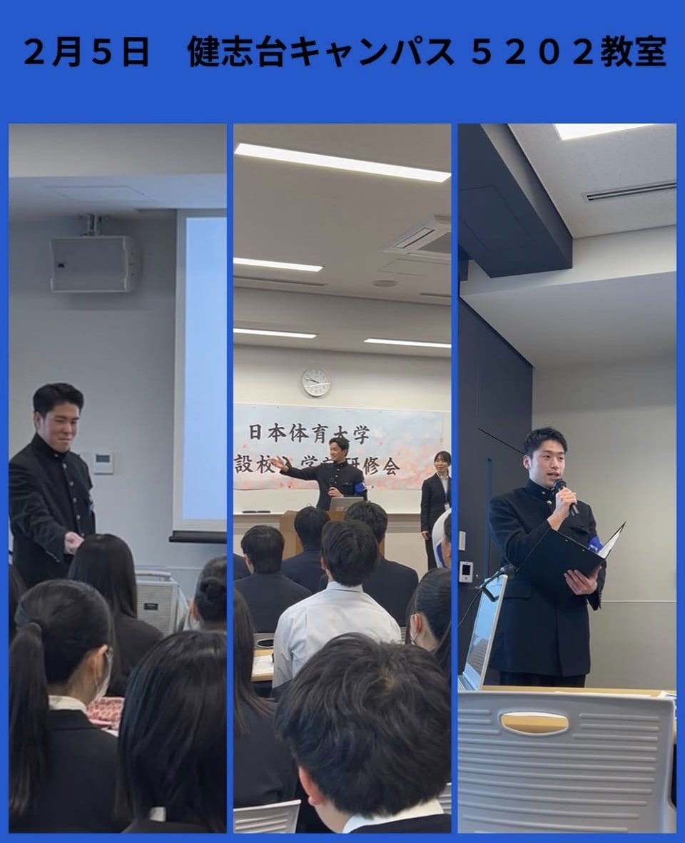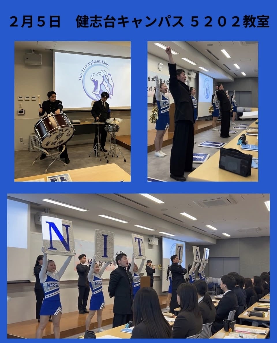 2月3日に世田谷キャンパス記念講堂、5日に健志台キャンパス5202教室において、本学の合格通知を受け取った併設校の学生を対象に、入学式に先立ち、本学の校歌指導を実施しました。当日は、入学後にリーダーとして周囲を牽引していく存在となることを期待し、その想いを込めて指導を行いました。また、複数ある応援スタイルの一つとして、駅伝等で実施している応援を披露しました。入学後、皆さんと共に活動できることを心より願っております。