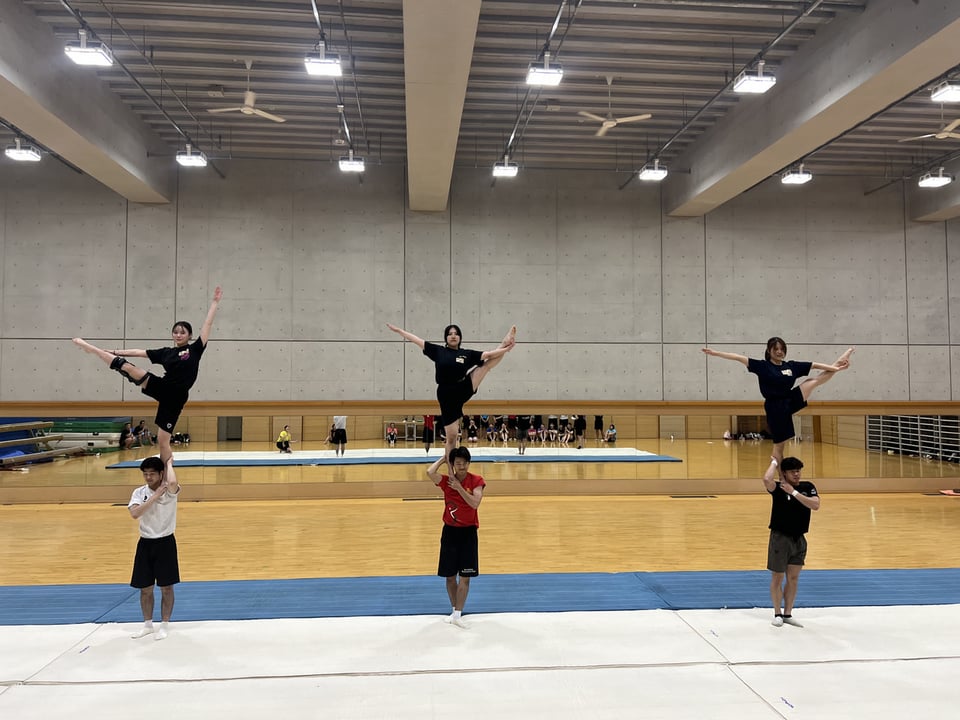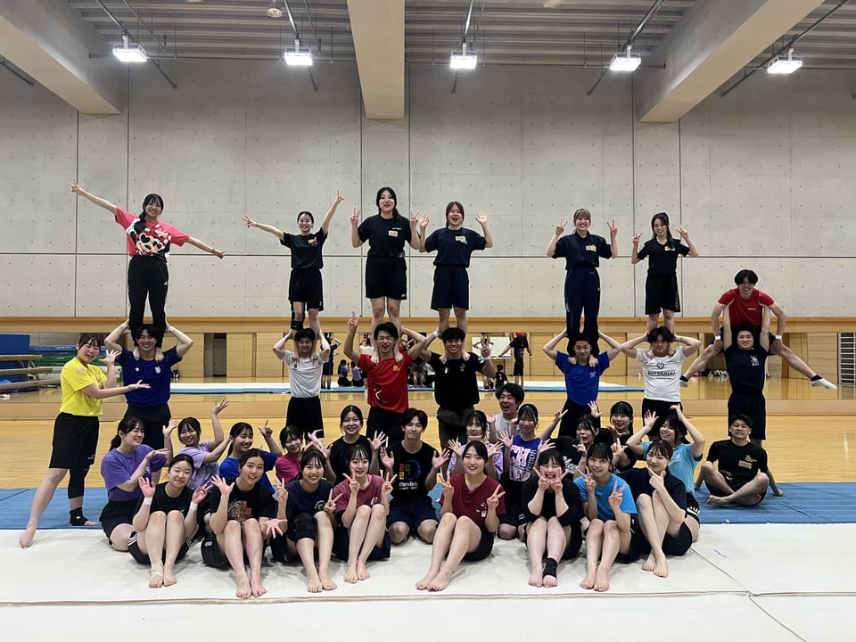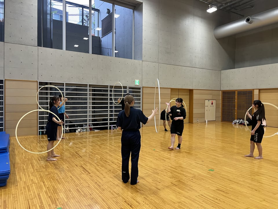 本日は、フラフープを投げてキャッチしたり、身体のいろんな部位を使って回したりする手具体操と基礎技やバク転を行う器具体操、ノムラショルダーからの組移行や垣根Y字を行う組立体操の3ブースで体験を行いました🔥