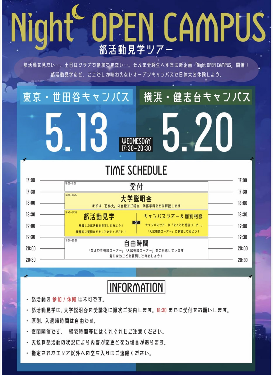 5月13日(水)に東京・世田谷キャンパスにてNight OPEN CAMPUS 部活動見学ツアーが開催されます✨