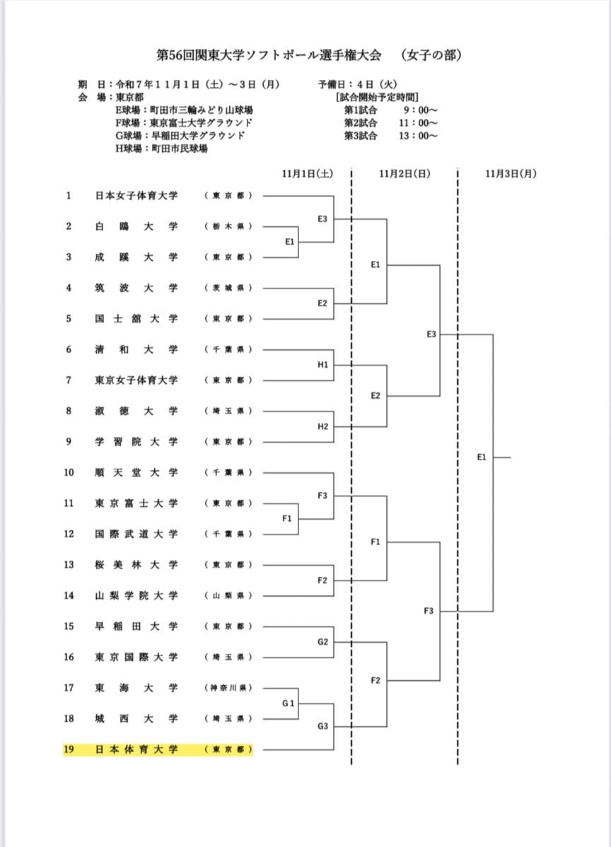 11月1日(土)から11月3日(月)に行われます、『第56回関東大学ソフトボール選手権大会』の組み合わせが決定致しましたので、お知らせ致します。
