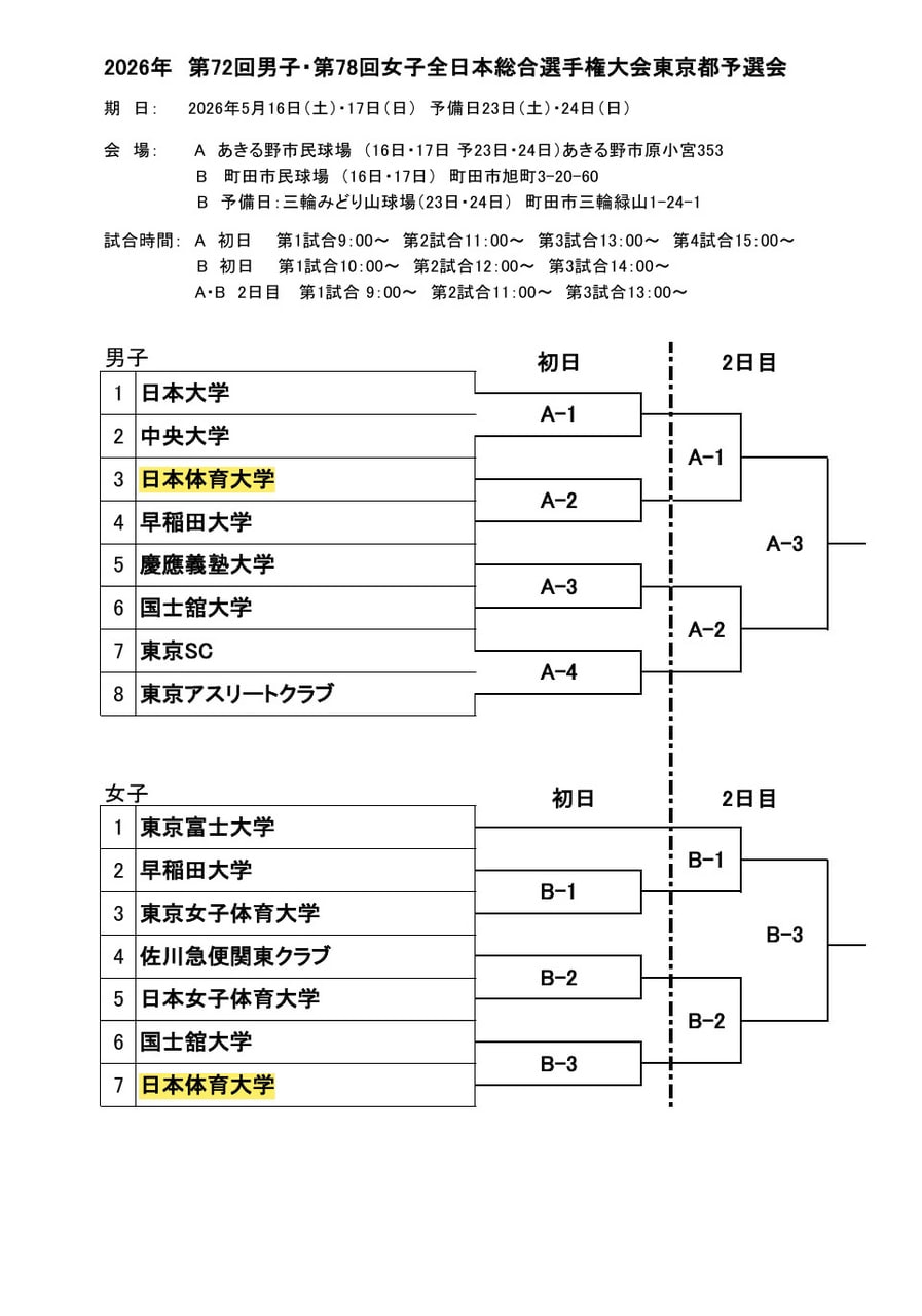 5月16日(土)~17日(日)にかけて行われます、『第72回男子・第78回女子全日本総合選手権大会東京都予選会』の組み合わせが決定致しましたので、お知らせ致します。